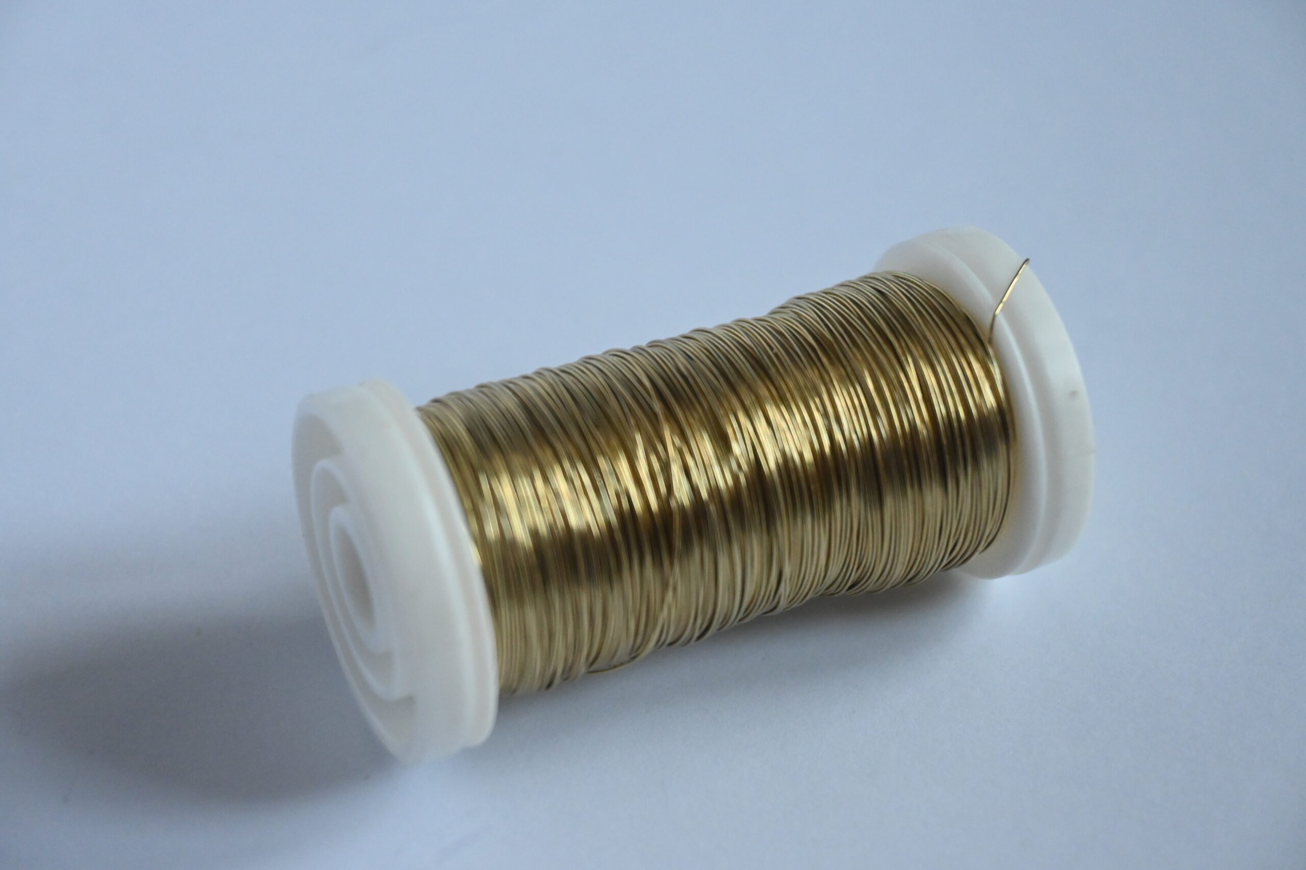 Cienki, gładki, lakierowany drucik florystyczny nawinięty na plastikową szpulę w kolorze złotym. Bardzo plastyczny, sprawdzi się w wielu kompozycjach florystycznych jak i przy wyrobie biżuterii. Średnica 0,3 mm. Waga 50g.