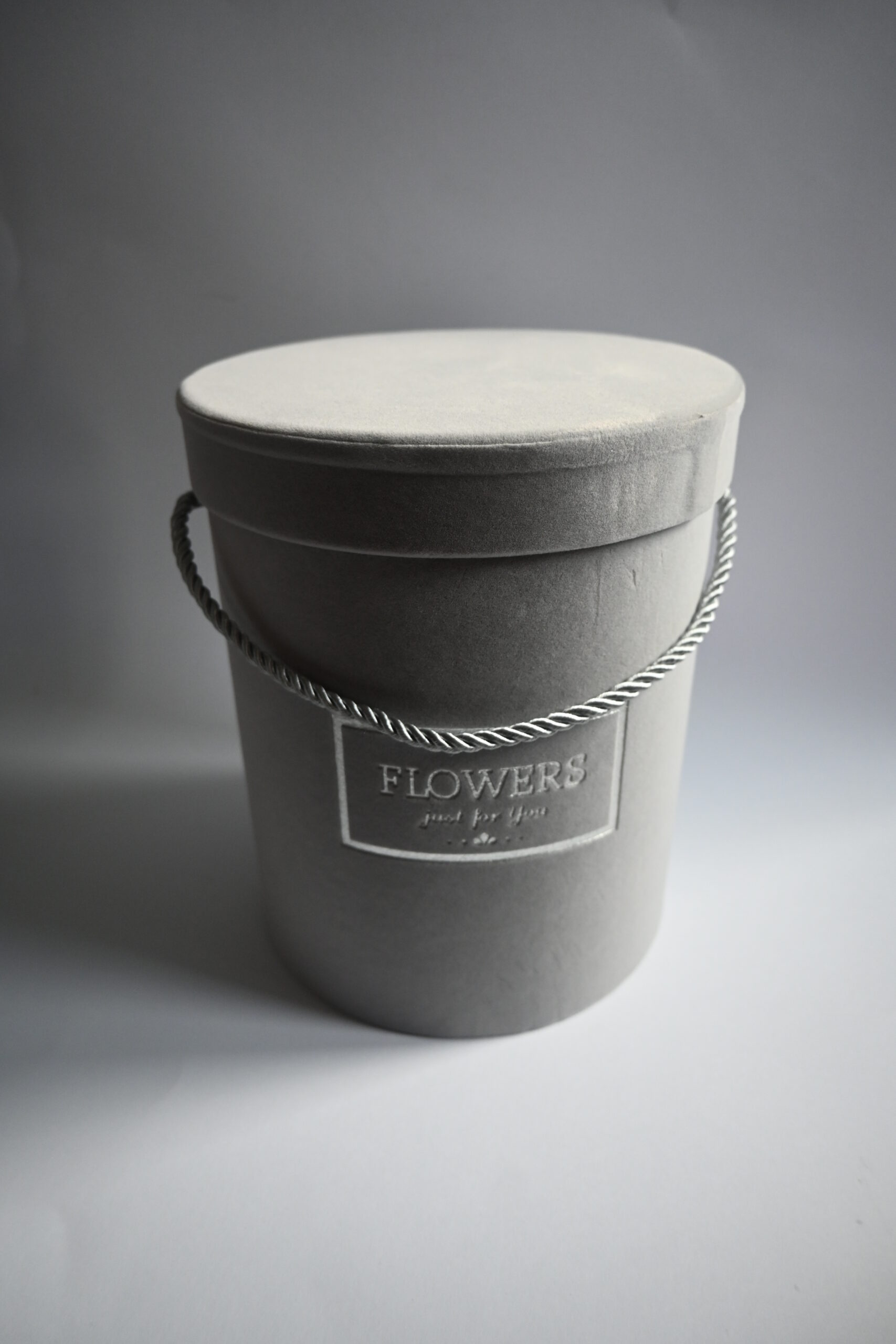 Elegancki flower box na żywe i sztuczne kwiaty, pokryty welurem. Plastikowy pojemnik umieszczony wewnątrz zabezpiecza przed przemoczeniem. Pojemnik z rączką z atłasowego, skręcanego sznurka.