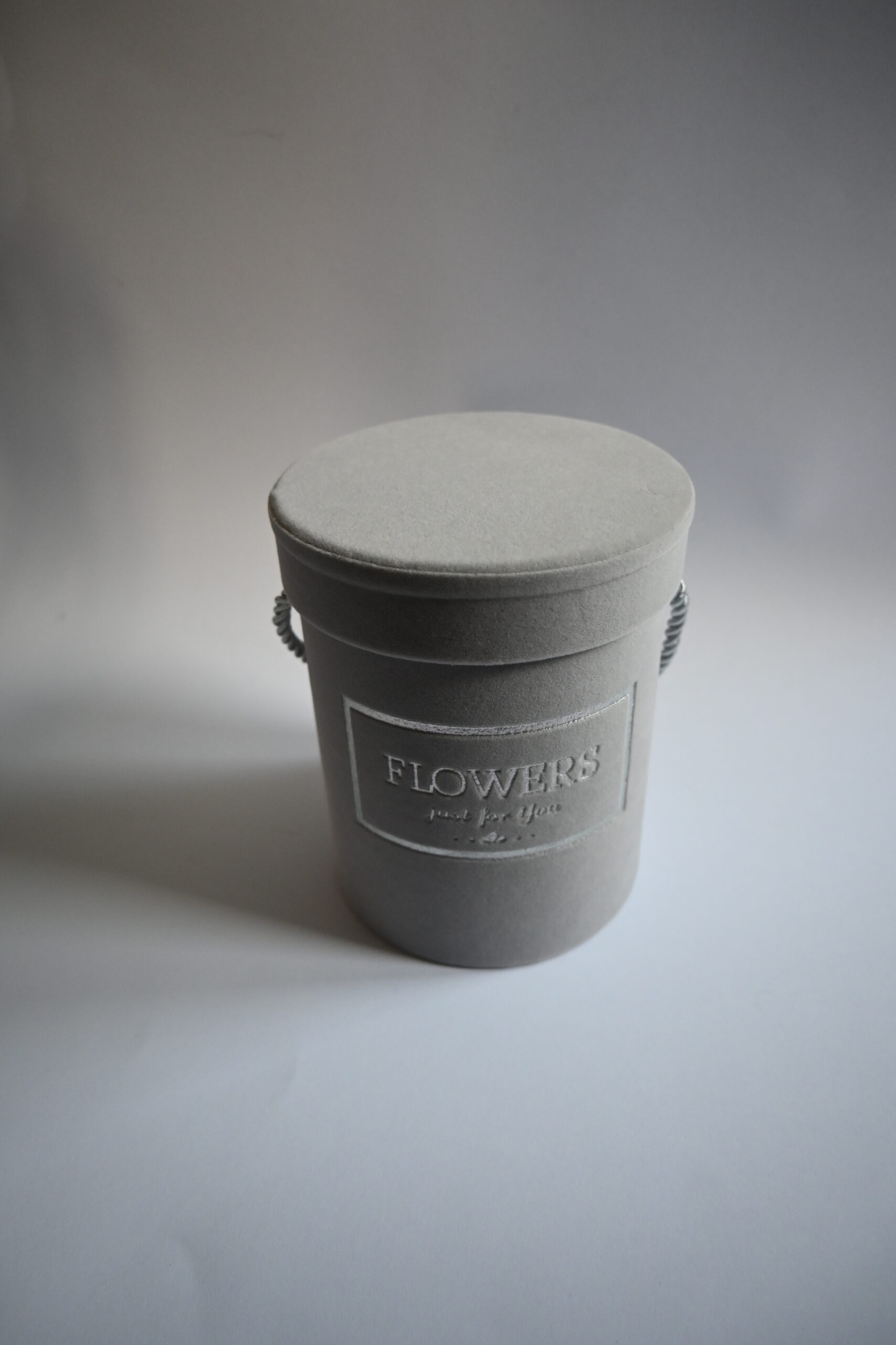 Elegancki flower box na żywe i sztuczne kwiaty, pokryty welurem. Plastikowy pojemnik umieszczony wewnątrz zabezpiecza przed przemoczeniem. Pojemnik z rączką z atłasowego, skręcanego sznurka.